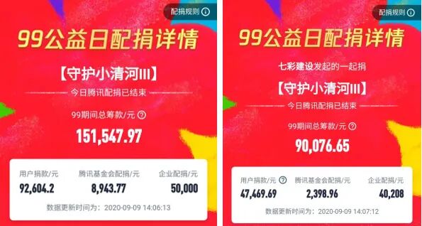 截止9月9日14:00,“守护小清河”第三期公益行动共筹得善款151547.97元;其中,七彩建设完成筹款90076.65元。