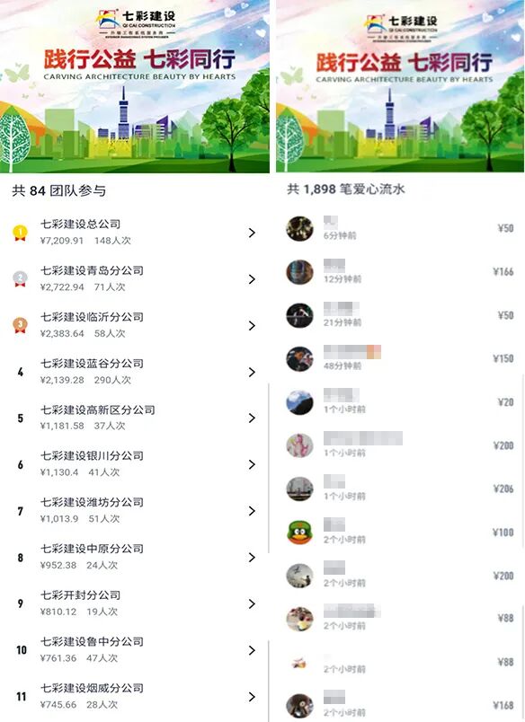 在由七彩建设发起的筹款中,共有84个团队参与筹款,产生共计1898笔筹款。在此,特别感谢筹款数额前10名的团队在本次活动中不遗余力的互动和付出!